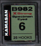 specimen eye, 2 XStrong. Model # B982, listed in sizes 6-16, 25 hooks per package, bronze color.